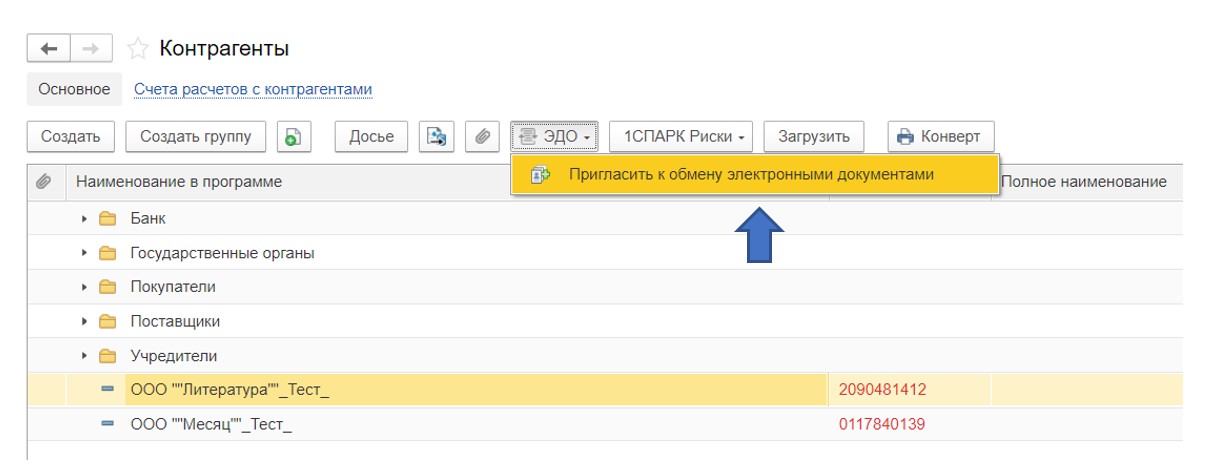 Оформить заявку на настройку роуминга можно непосредственно в окне отправки приглашения, оно откроется из справочника «Контрагенты» по кнопке «ЭДО».