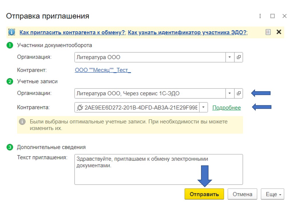 Если на форме «Отправка приглашения» отсутствует поле выбора оператора контрагента, значит, в сервисе 1С-ЭДО пока нет сведений ни об одной учетной записи этого контрагента. В этом случае вам необходимо связаться с контрагентом, получить его идентификатор ЭДО и ввести его в соответствующее поле «Учетная запись контрагента».