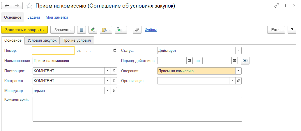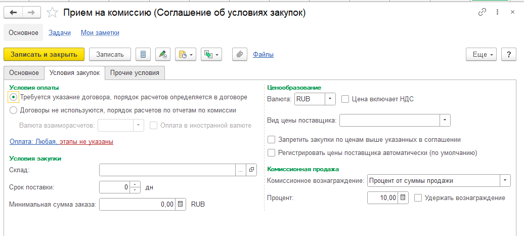 В программе возможно создать соглашение с комитентом на комиссионный приём товаров. Для этого в разделе «Закупки» ‒ «Соглашения с поставщиками» создаётся соглашение об условиях закупок с видом «Приём на комиссию», в котором можно сразу задать склад для хранения товаров, вид цен, а также принцип расчёта комиссионного вознаграждения (рис. 1, 2).