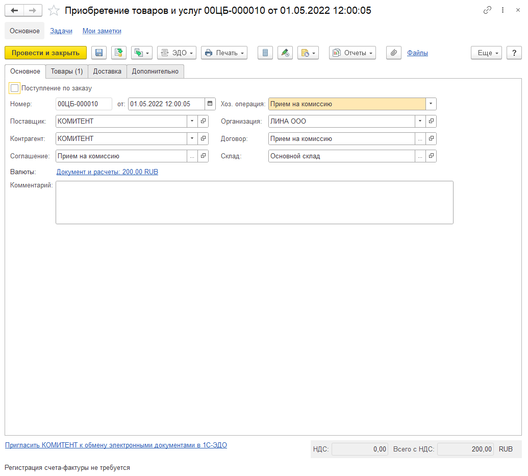 Получение товара на комиссию оформляется через документ «Приобретение товаров и услуг» с видом «Приём на комиссию», в котором можно выбрать созданное ранее соглашение и оформить приём товара (рис. 3, 4).
