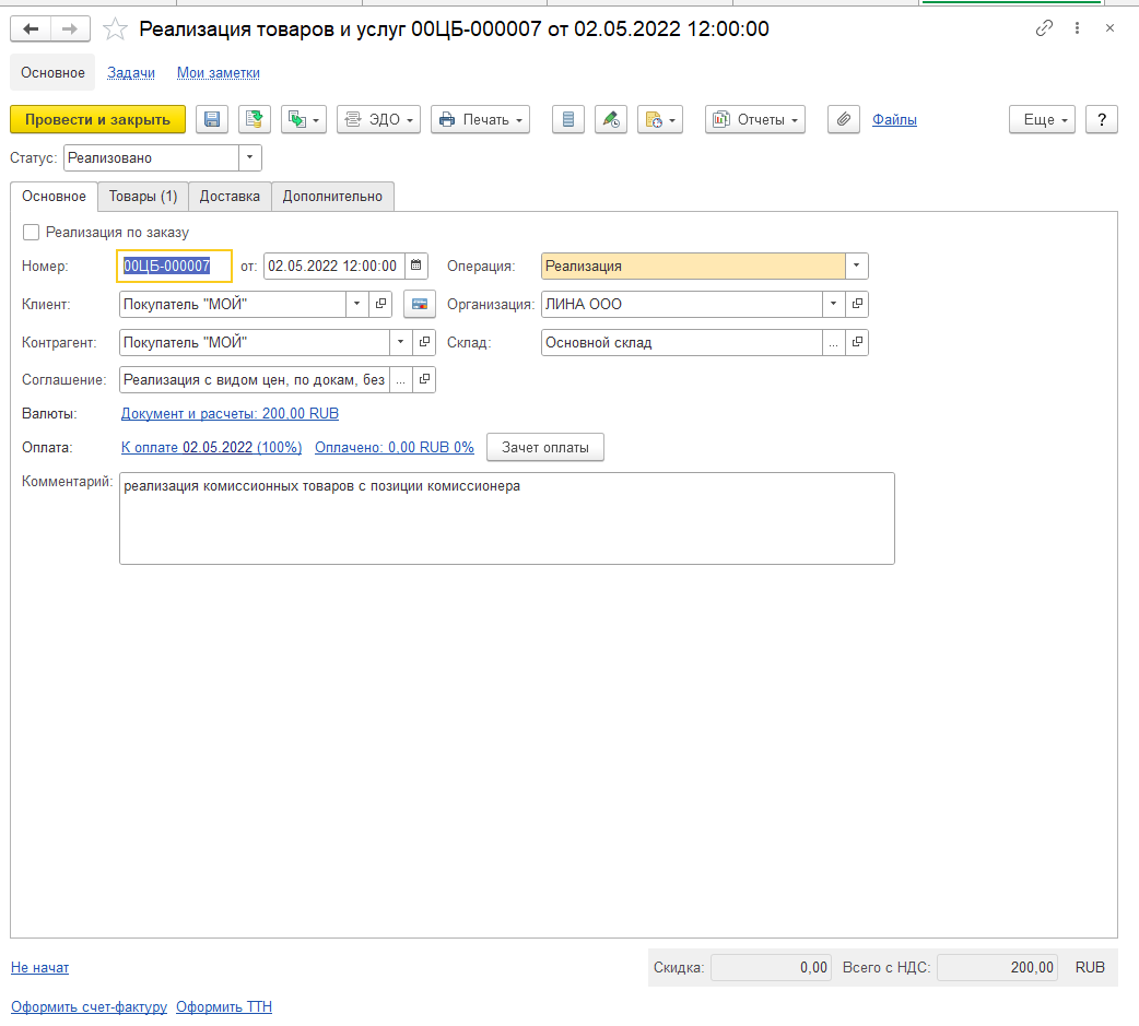 Продажа полученных на комиссию товаров отражается стандартными документами реализации собственных товаров, так как в них не указывается, продаём собственный или комиссионный товар. Возможно оформить как оптовую, так и розничную продажу. Принцип определения, продаётся комиссионный или собственный товар, следующий: в первую очередь списывается товар, который пришёл первым в организацию.