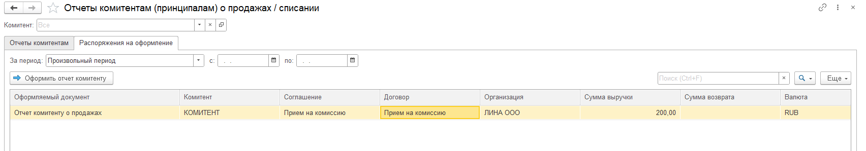 Доступно поле с выбором отбора периода для отображения, группировка проходит по виду оформляемого документа, комитенту и валюте.