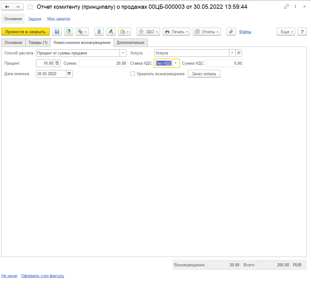 На вкладке «Товары» по кнопке «Оформить недостающие счета-фактуры» можно выписать счета-фактуры покупателю, если ранее на основании реализаций они не были созданы (рис. 9). На вкладке «Комиссионное вознаграждение» (рис. 10) можно задать или изменить способ расчёта вознаграждения, если он поменялся (изначально принцип расчёта и размер заполняются в соглашении с комитентом). Для его расчёта по товарам необходимо вернуться на вкладку «Товары», и по кнопке «Рассчитать вознаграждение» программа распределит сумму. Также по сумме вознаграждения в программе есть возможность выписать счёт-фактуру по ссылке «Оформить счёт-фактуру» внизу документа (рис. 10).