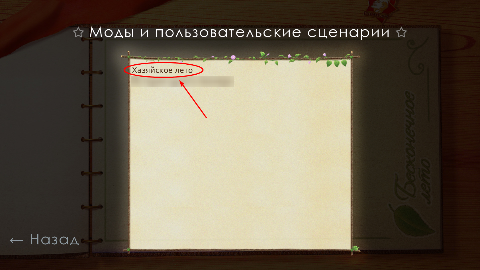 7. Заходим в игру «Бесконечное лето» на главном экране нажимаем на инструменты (табуретка) листаем вниз и находим пункт «Моды и пользовательские сценарии», нажимаем и выбираем «Хазяйское лето».