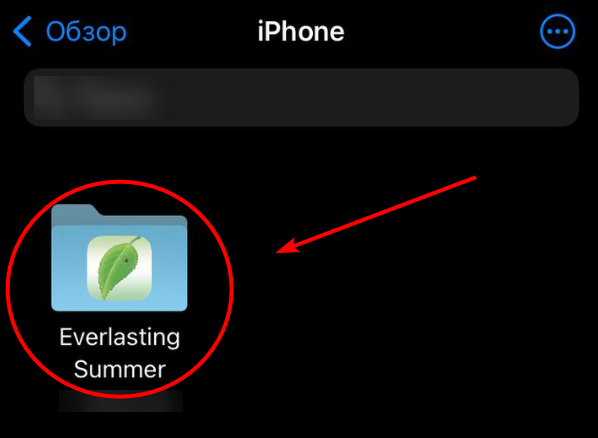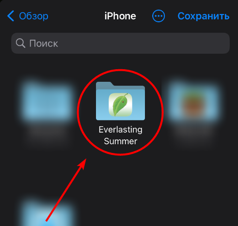 5. Переходим во вкладку «Обзор» выбираем пункт «iPhone», далее папку «Everlasting Summer» и нажимаем сохранить.