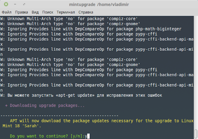 Для того, чтобы загрузить пакеты, необходимые для обновления до Linux Mint 18, введите (скопируйте) и выполните (нажать Ввод) следующую команду: