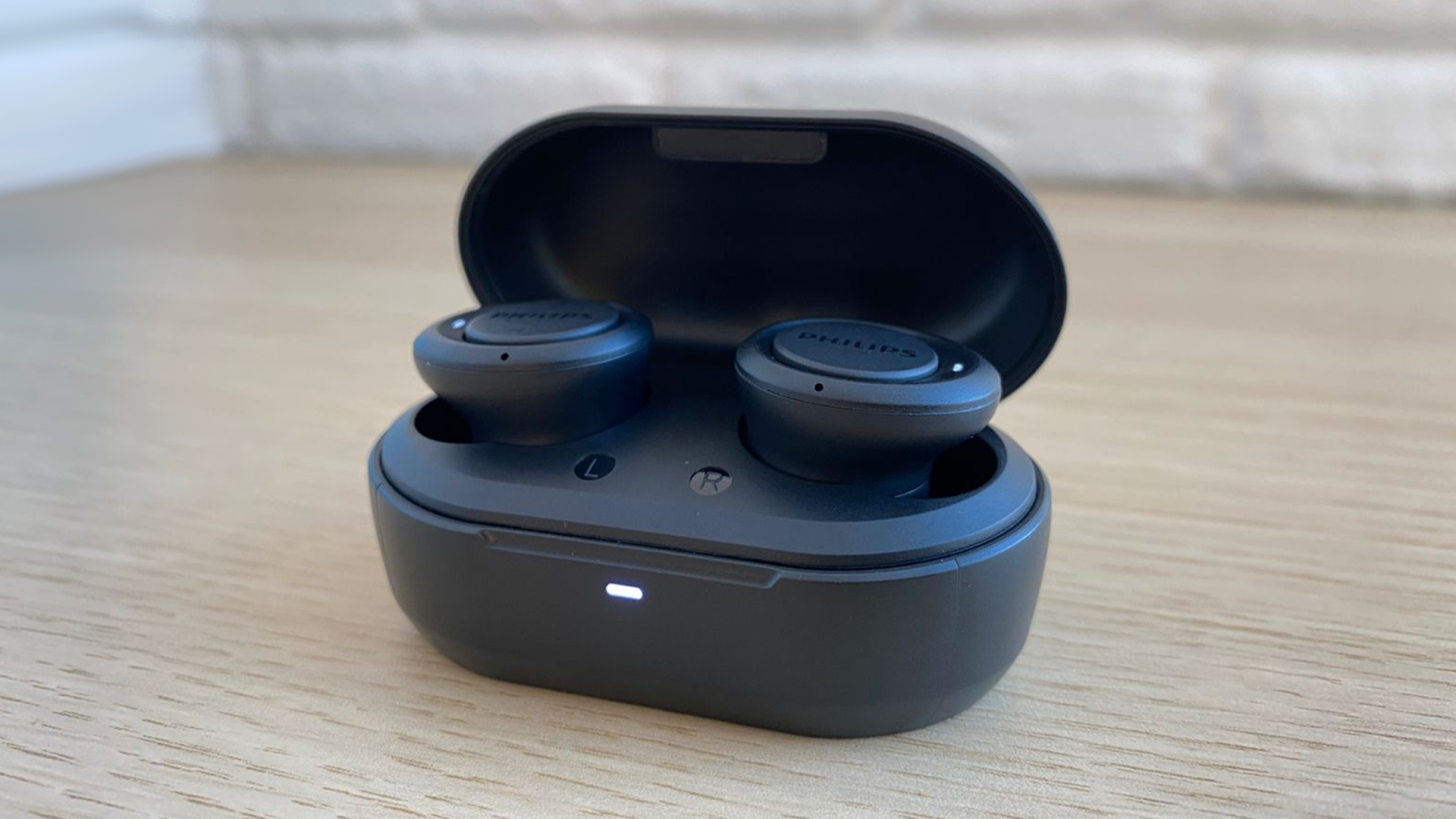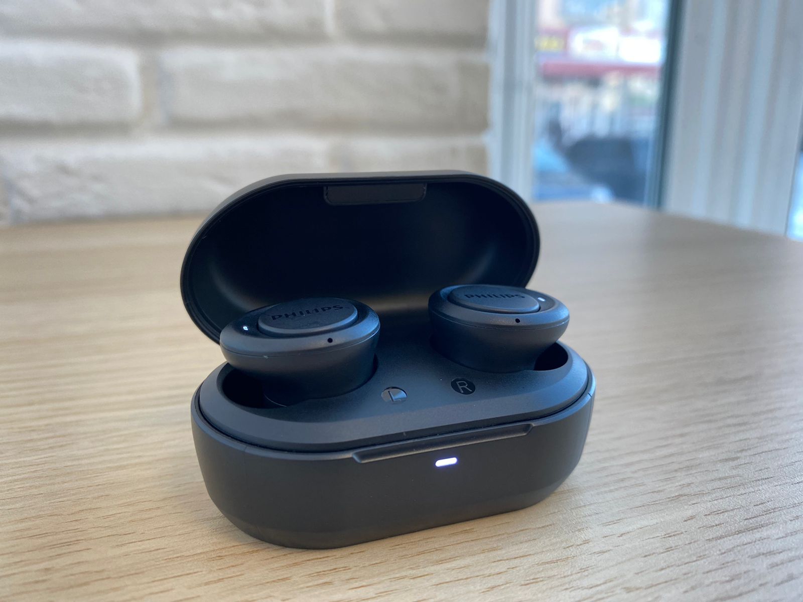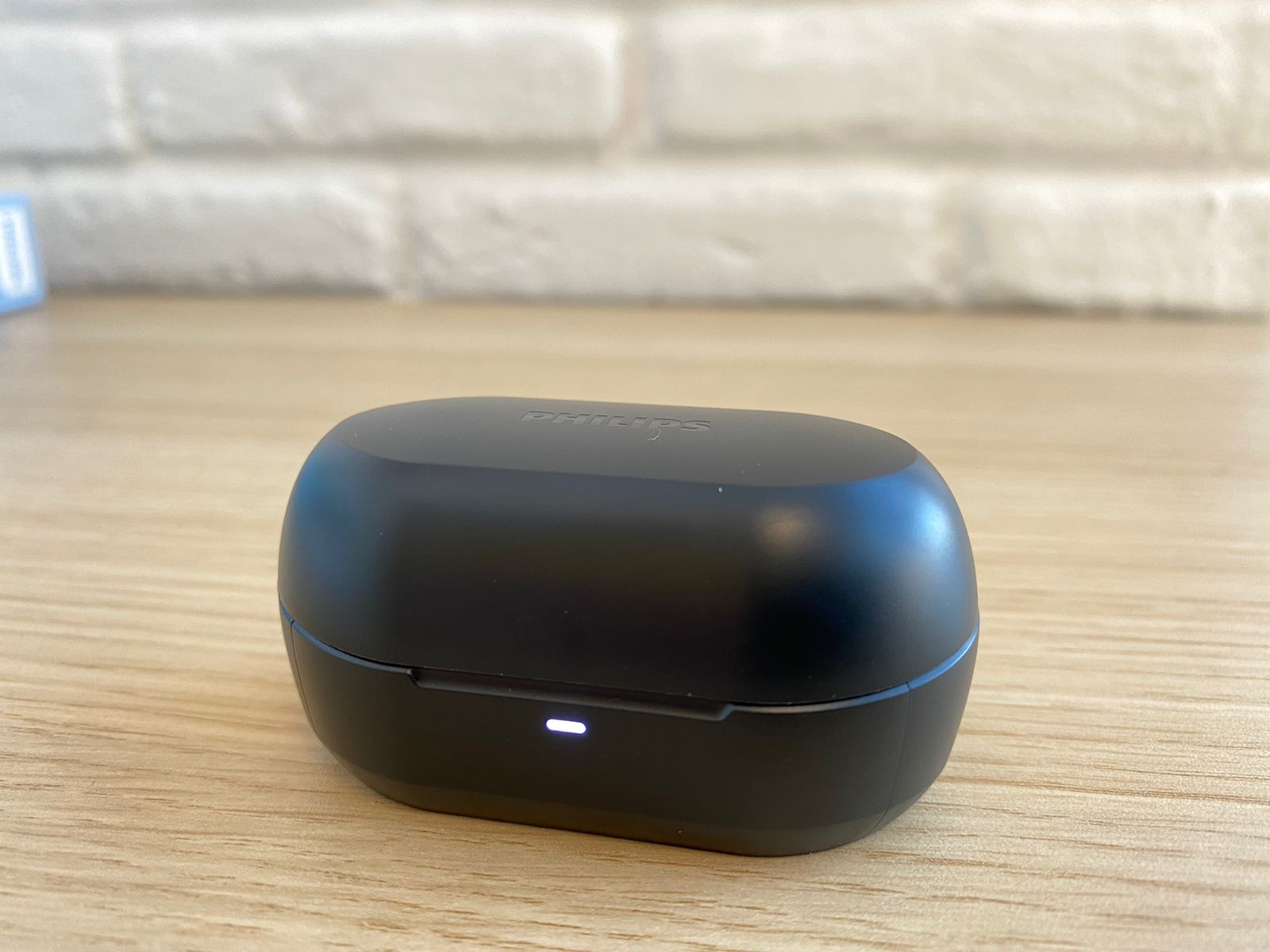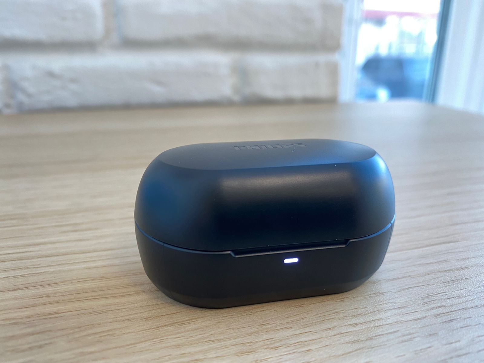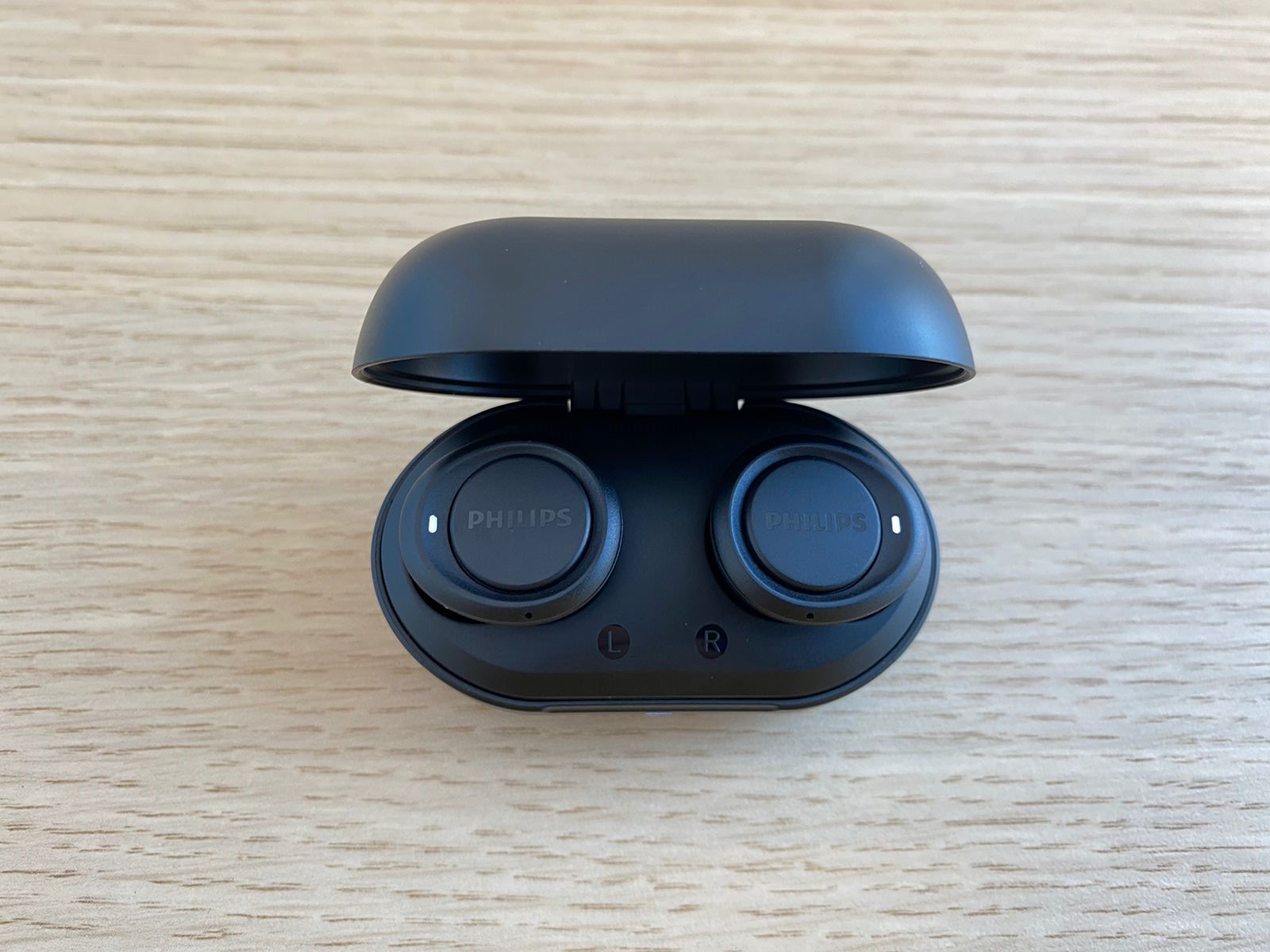 Хочу начать с того, что Philips TAT1215 продаётся только в одном цветовом решении — черный. На верхней стороне кейса расположился логотип компании. Сам зарядный чехол выполнен из достаточно твёрдого матового пластика.